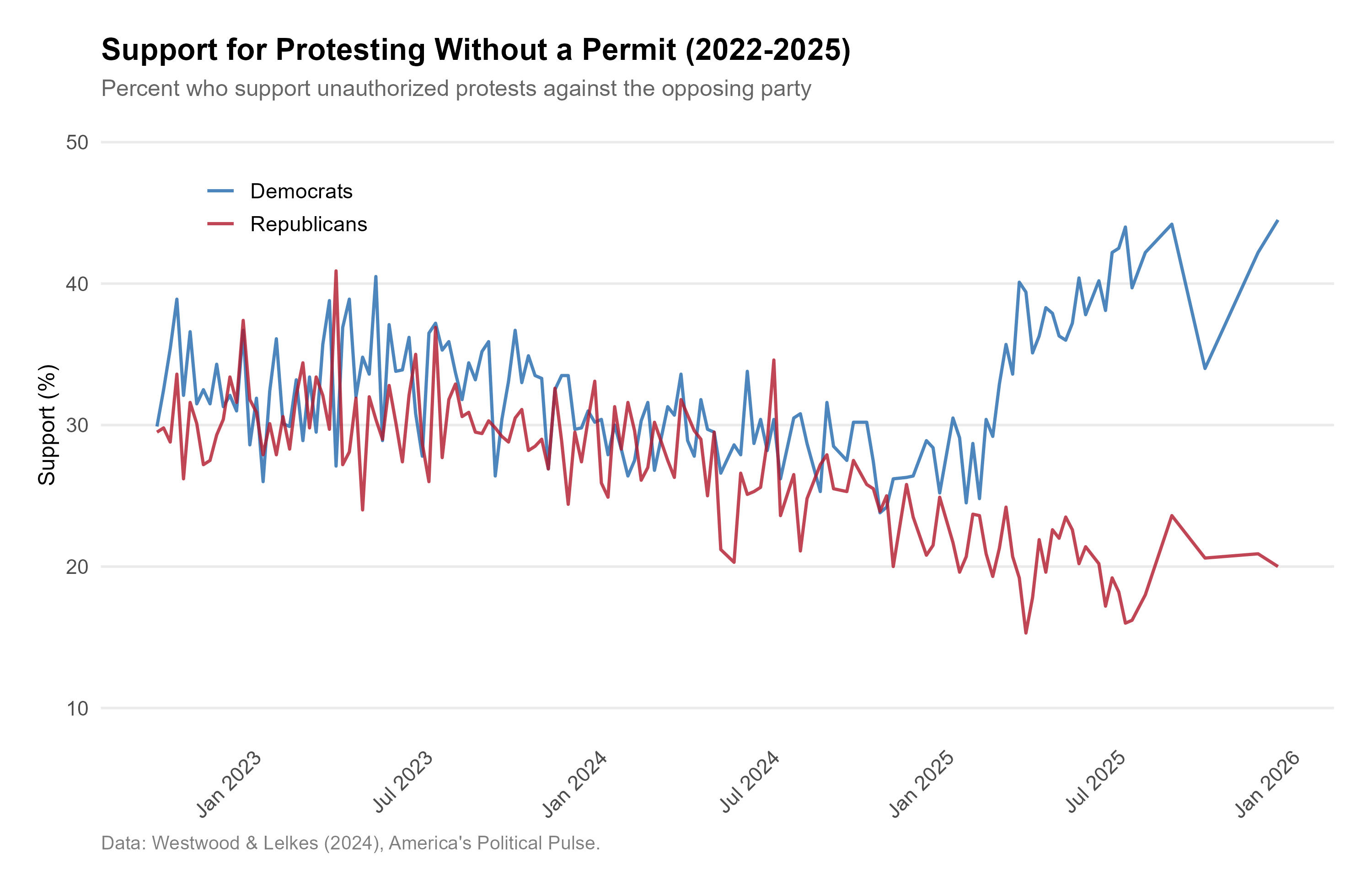 When asked whether they support someone protesting without a permit against the opposing party, Democrats and Republicans were nearly identical in late 2022, both around 30%. By late 2025, Democrats had risen to over 40% while Republicans dropped below 20%. Democrats have become more supportive of protest as a political tool; Republicans less so.