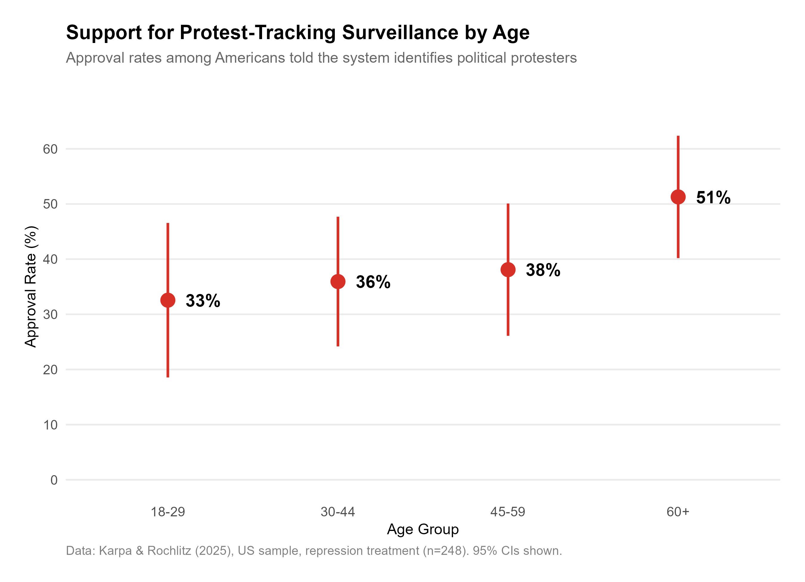 Only 33% of young Americans (ages 18-29) supported the system when told it could identify protesters. Among those over 60, support jumped to 51%.