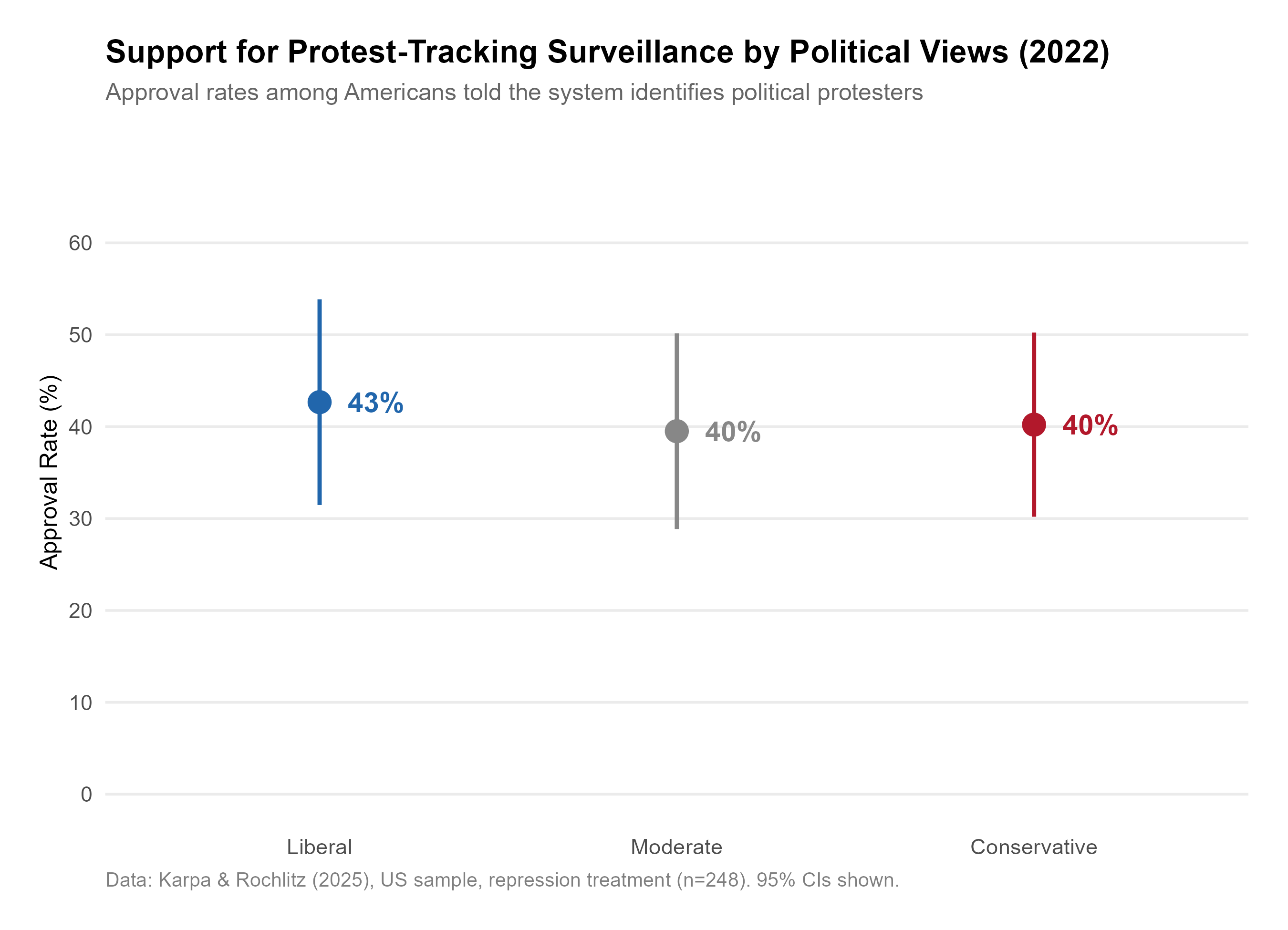 In our 2022 survey data, the partisan divide on protest surveillance was surprisingly small. Liberals, moderates, and conservatives all showed similar levels of support, around 40%.