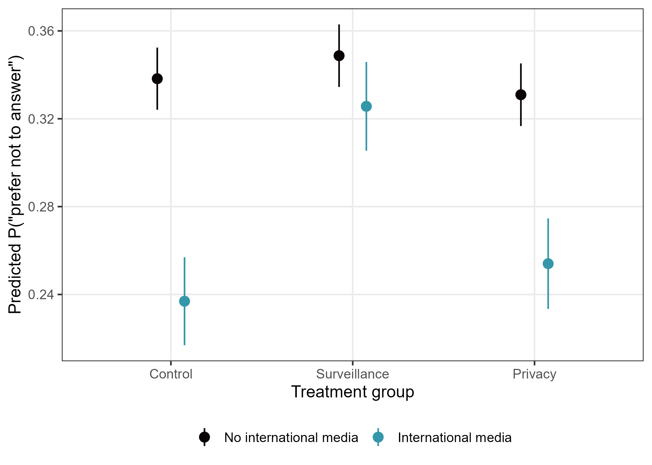 The privacy treatment does not recover the effect. Telling people their responses are encrypted does not make them more willing to answer sensitive questions. The privacy condition yields a small, statistically insignificant effect of 0.3 percentage points. This asymmetry is consistent with loss aversion (Schmidt and Zank 2005), but it may also reflect something more specific to autocratic contexts. The surveillance treatment carried urgency and a concrete threat. The privacy treatment, promising encryption, was semantically closer to the neutral control condition and likely less credible in a country where the government has a track record of intercepting encrypted communications. For policies that aim to enhance political discourse, this means privacy-preserving technologies are no solution for increasing surveillance capabilities. They are costly, access is unevenly distributed, and they are simply not as effective because of loss aversion. The damage from surveillance salience is not easily reversed.