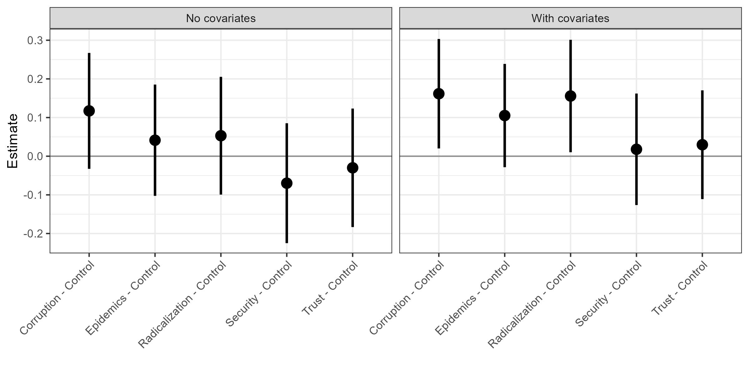 We next estimate average treatment effects (ATEs) of each institutional-gap framing relative to the control.