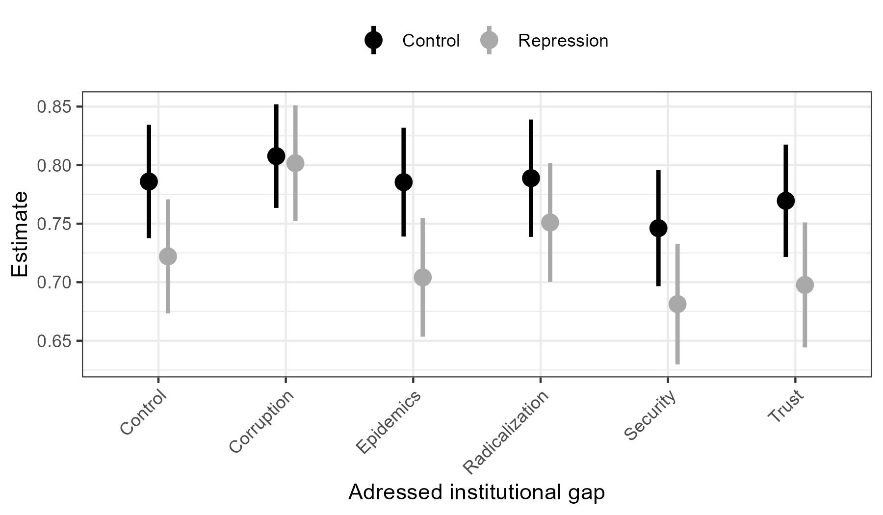 - When corruption is paired with repression, support increases dramatically — by about 0.5 points on a 4-point scale.